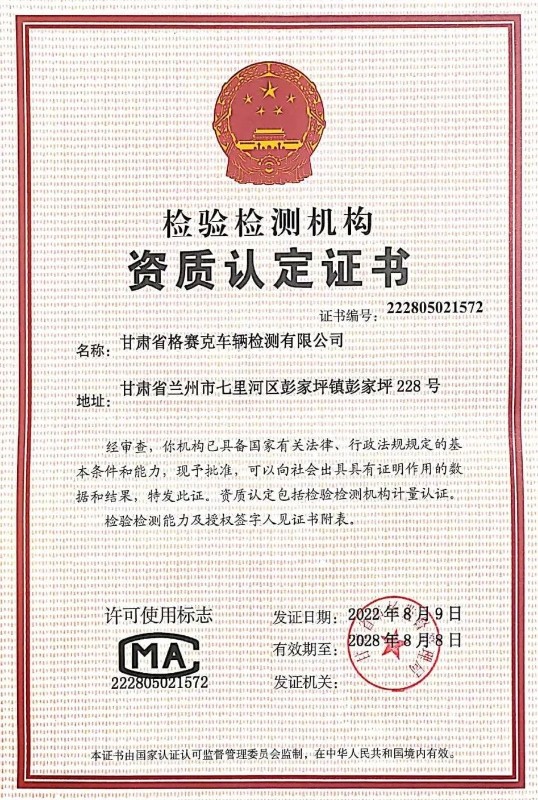 近日,裝備公司子公司甘肅省格賽克車輛檢測有限公司順利取得甘肅省市場監(jiān)督管理局頒發(fā)的檢驗檢測機構(gòu)資質(zhì)認定(CMA)換證復(fù)核資質(zhì)證書,確保了各項車檢業(yè)務(wù)的順利開展。