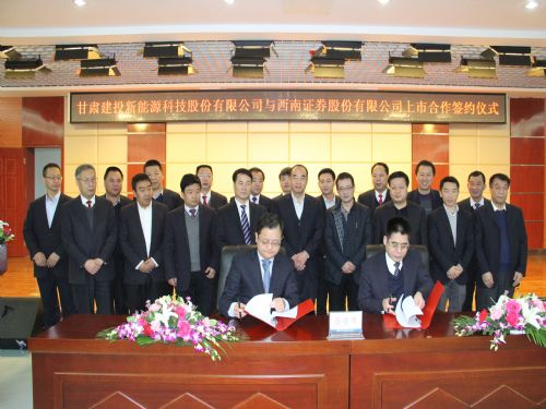 2014年1月6日,甘肅建投新能源科技股份有限公司與西南證券股份有限公司上市合作簽字儀式在裝備公司十樓會(huì)議室舉行。甘肅建投裝備制造有限公司黨委書(shū)記、甘肅建投新能源科技股份有限公司董事長(zhǎng)張旭軍與西南證券西北管理總部總經(jīng)理呂輝分別致詞。集團(tuán)總公司副總經(jīng)理張志明、西南證券西北管理總部領(lǐng)導(dǎo)、裝備公司領(lǐng)導(dǎo)參加儀式。