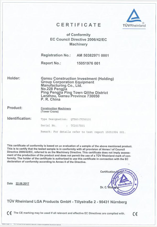 甘肅建投裝備制造有限公司生產的高漠牌塔式起重機QTZ63(TC5013)于2017年8月22日通過了歐盟關于產品樣機和資料的審核,取得了由德國萊茵TüV集團(Notified Body number:0035)頒發(fā)的CE證書,證書編號為:AM 50382971 0001。