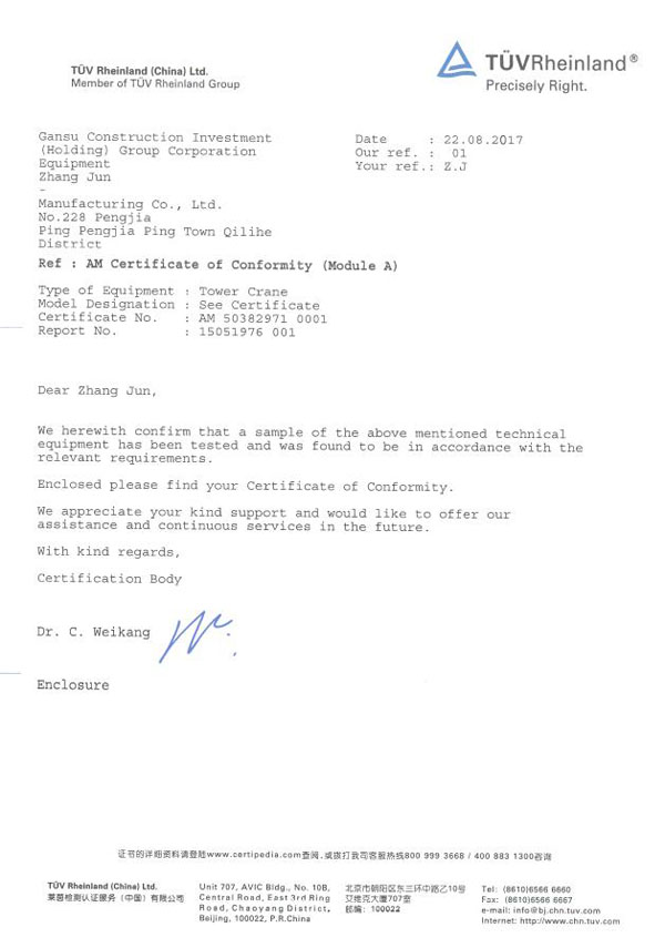 甘肅建投裝備制造有限公司生產的高漠牌塔式起重機QTZ63(TC5013)于2017年8月22日通過了歐盟關于產品樣機和資料的審核,取得了由德國萊茵TüV集團(Notified Body number:0035)頒發(fā)的CE證書,證書編號為:AM 50382971 0001。